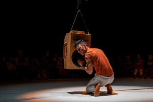 An acrobat swings, flings, and juggles with speakers that produce natural sounds. He covers them, muffles them, hands them out. In this way he makes a live acrobatic, moving sound composition. He sticks speakers to his body, goes up in the air.