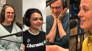 Aflevering 1 - Een rode wouw, gemis en ijsbergen. Hannah Lyssens van aifoon zit aan tafel met acteur Gabriel Gjonlulaj, audiomaker Lucas Derycke en vogelaar Barbara De Coninck.